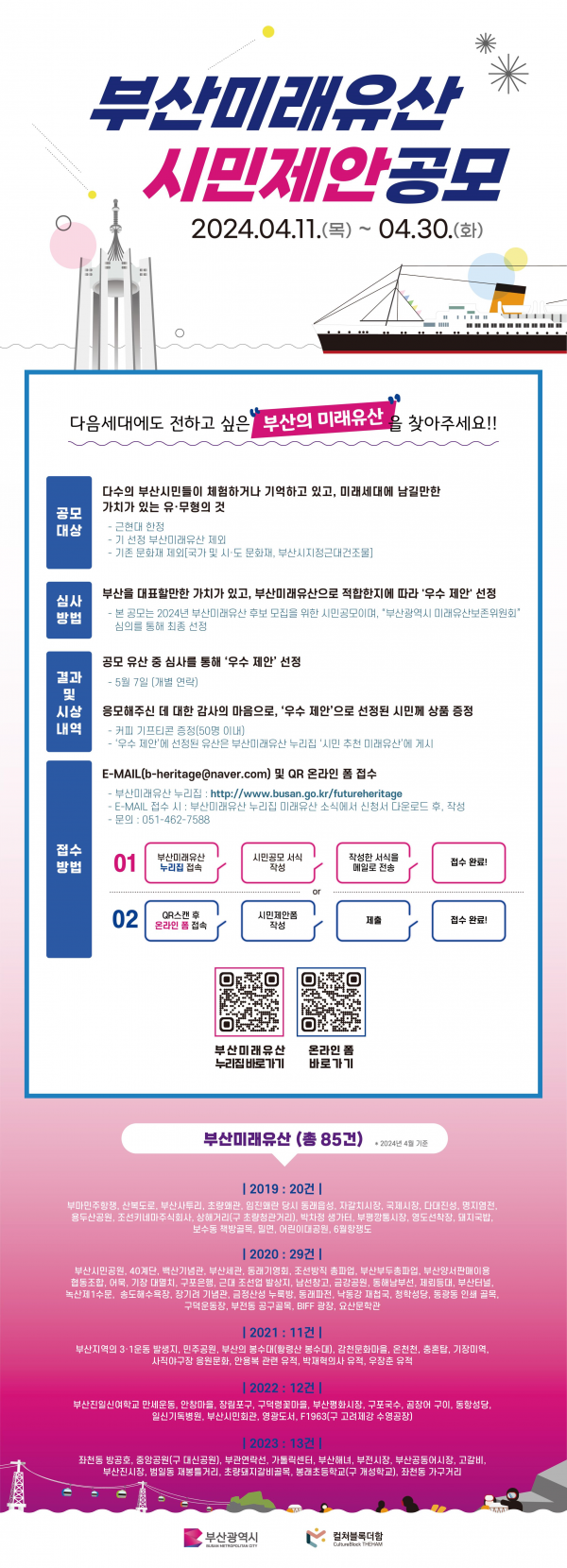 [충청뉴스큐] 부산시는 오늘부터 4월 30일까지 2024년 부산미래유산 선정을 위한 부산미래유산 시민제안 공모를 추진한다고 밝혔다.