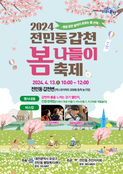 [충청뉴스큐] 대전 유성구 전민동이 13일 오전 10시부터 전민동 갑천변에 닿은 봄의 정취를 전하기 위한 ‘2024 전민동 갑천 봄나들이 축제’를 개최한다.