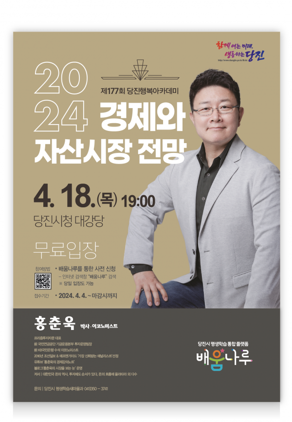 [충청뉴스큐] 당진시가 오는 18일 오후 7시 당진시청 대강당에서 경제전문가로 유명한 프리즘투자자문대표 홍춘욱 박사를 초청해 제177회 행복 아카데미를 개최한다.