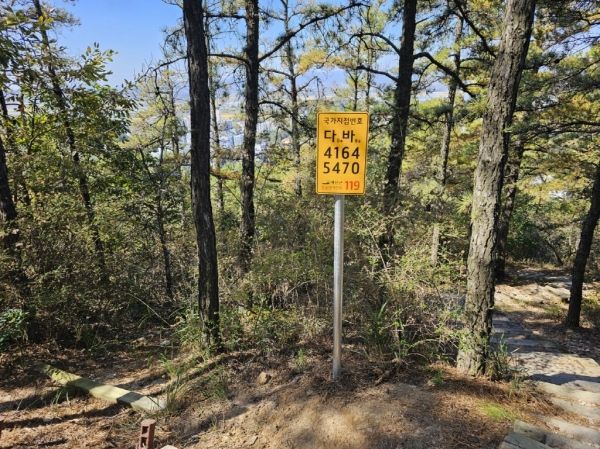국가지점번호는 건물이 없어 도로명주소를 부여하지 않은 산림이나 저수지 등 비거주 지역에 부여한 위치 좌표로 한글 2자리와 숫자 8자리 등 10자리 고유번호가 표시된 안내판이다.