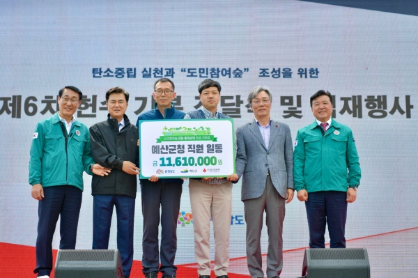 이해인 전국공무원노동조합 예산군지회장, 임재영 충남공공노동조합 예산군청지부장은 예산군청 직원을 대표해 지난 11일 홍예공원에서 열린 도민 참여숲 기부금 전달식에 참석해 직원들이 십시일반 모은 성금 1161만원을 기탁했다.