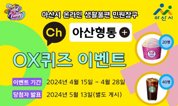 [충청뉴스큐] 아산시가 카카오톡 생활 불편 민원창구인 ‘아산형통’ 개설 1주년을 맞아 15일부터 28일까지 O·X 퀴즈 이벤트를 진행한다.