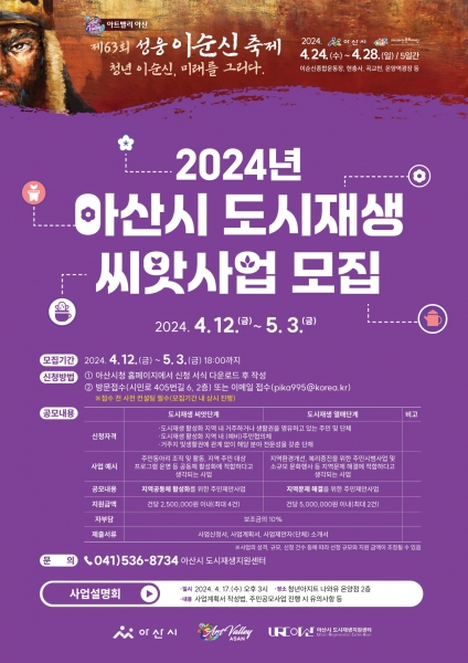 [충청뉴스큐] 아산시는 오는 5월 3일까지 지속가능한 도시재생을 위한 도시재생 씨앗사업을 접수 받는다고 밝혔다.