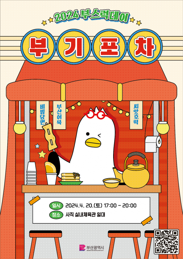 [충청뉴스큐] '부기'가 대접하는 '부산의 맛'을 즐겨볼 수 있는 행사가 열린다 부산시는 오는 4월 20일 오후 5시 사직실내체육관 일대에서 시 소통 캐릭터 '부기'의 데뷔 3주년을 기념해 팬 이벤트 ‘부스럭데이-부기포차’를 개최한다고 밝혔다.