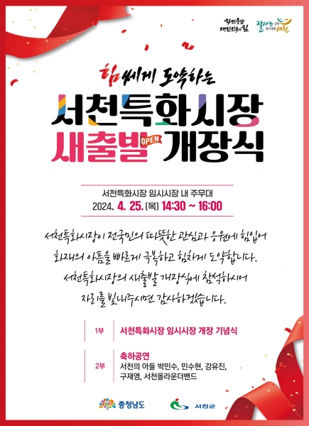 이후 농·수산물동 별도 무대에서 테이프 커팅식 후 시장을 돌며 장보기 행사가 진행되고 이어서 축하공연에서는 박민수, 민수현, 강유진, 구재영, 서천 올라운더 밴드가 출연해 행사의 대미를 장식할 계획이다.