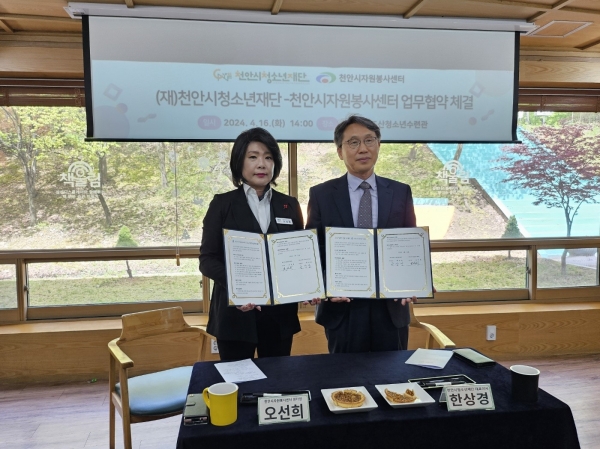 [충청뉴스큐] 천안시청소년재단은 지난 16일 천안시자원봉사센터와 청소년의 권익 증진과 자원봉사 참여 확산을 위해 업무협약을 체결했다.