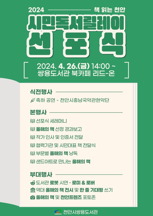 [충청뉴스큐] 천안시 쌍용도서관은 2024 시민독서릴레이 선포식을 오는 26일 쌍용도서관 북카페 리드-온에서 개최한다고 17일 밝혔다.