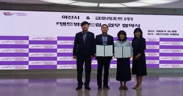 [충청뉴스큐] 아산시와 ㈜금호리조트는 지난 16일 취약계층 아동의 가족기능 강화를 위해 가족친화 프로그램인 ‘함께라서 행복’, ‘텐트밖은 드림’ 사업 추진을 위한 업무협약을 체결했다.