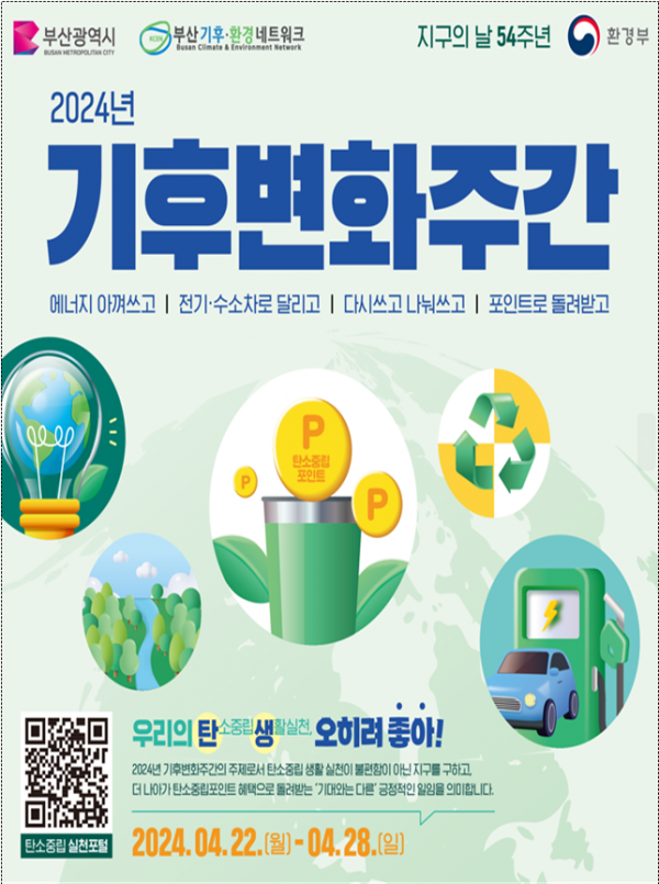 [충청뉴스큐] 부산시는 '제54주년 지구의 날'을 맞아 오는 22일부터 28일까지를 '제16회 기후변화주간'으로 정하고 이 기간 '우리의 탄소중립 생활 실천, 오히려 좋아'를 주제로 다채로운 기념행사를 개최한다고 밝혔다.