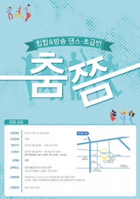 힙합 방송댄스 초급반 ‘춤쯤’은 10대부터 20대를 대상으로 15명 모집하며 5월 2일부터 7월 4일까지 매주 목요일 저녁 오후 6시부터 8시 주 1회씩 10주차로 진행될 예정이다.