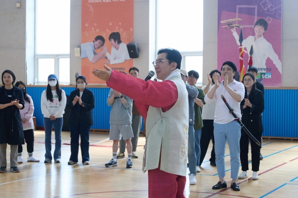 [충청뉴스큐] 박경귀 아산시장은 18일 아산시 청소년교육문화센터 실내체육관에서 진행한 뮤지컬‘필사즉생’ 연습 현장에 방문해 아산시립합창단원을 격려했다.