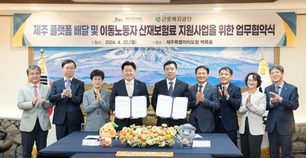 제주도와 근로복지공단은 22일 제주도청 백록홀에서 ‘제주 플랫폼 배달 및 이동노동자 산재보험료 지원사업 업무협약’을 체결했다.