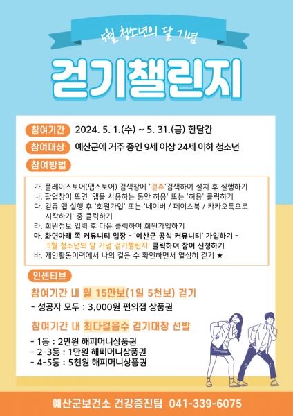 [충청뉴스큐] 예산군보건소는 ‘5월 청소년의 달’을 맞아 오는 1일부터 관내 청소년을 대상으로 모바일 플랫폼을 활용해 걷기 참여 잇기를 운영한다.