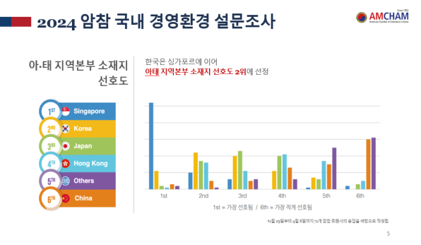 보고서 내용 중 최근 주한미국상공회의소가 800여 개 회원사를 대상으로 실시한 조사에서 한국은 싱가포르에 이어 아태 지역본부 소재지 선호도 2위에 선정됐다.