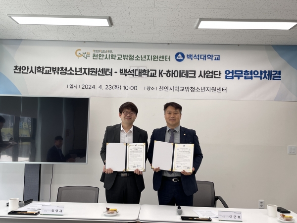 [충청뉴스큐] 천안시청소년재단 천안시학교밖청소년지원센터는 지난 23일 백석대학교 K-하이테크 사업단과 학교 밖 청소년의 실질적인 자립 역량 강화 지원을 위해 업무협약을 체결했다.