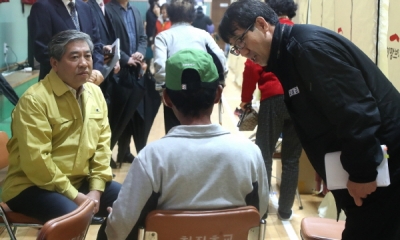 송 의장은 이날 오후 고성군 토성면사무소 산불현장통합지휘본부와 천진초등학교 체육관에 차려진 이재민 대피소를 잇따라 방문했다. 그는 “아픔을 나누는 데 동참하겠다”며 120여 이재민을 위로하고 수건·칫솔·치약 등 300만 원 상당의 재난구호품을 전달했다.