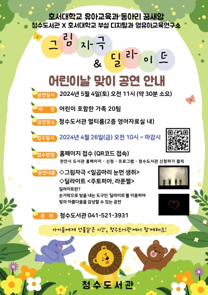 ‘그림자극&딜라이트’ 공연은 호서대학교 부설 디지털과 영유아교육연구소에서 호서대학교 유아교육과 동아리 꿈새암 학생들이 1년 동안 준비한 공연으로 어린이날을 맞이해 청수도서관에서 막을 올리게 됐다.
