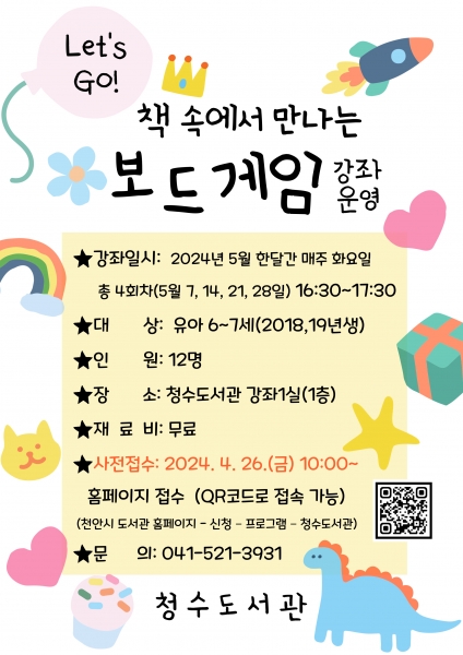 [충청뉴스큐] 천안시도서관본부 청수도서관는 Let’s Go 책 속에서 만나는 보드게임을 운영한다고 29일 밝혔다.