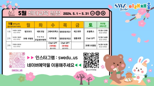 5월 교육은 포스터에 첨부된 정보무늬를 통해 신청할 수 있으며 기타사항은 울산정보산업진흥원으로 문의하면 된다.
