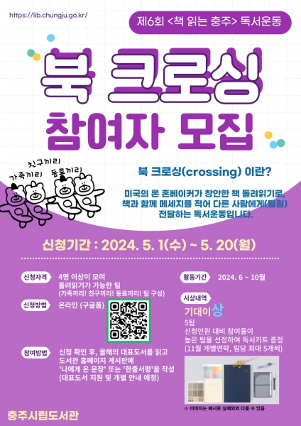 [충청뉴스큐] 충주시립도서관은 2024년 제6회 ‘책 읽는 충주’ 독서 운동의 일환으로 북 크로싱을 추진한다고 밝혔다.