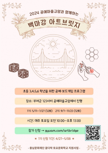 [충청뉴스큐] 부여군 공예마을규암협의회가 꿈다락 토요문화학교 ‘공예마을 규암과 함께하는 백마강 아트브릿지’ 교육생을 오는 8일까지 모집한다.