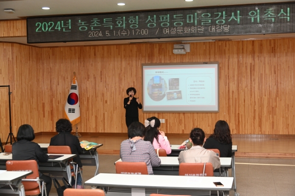 이날 위촉장 수여와 함께 여성친화도시 군민참여단의 성평등인형극 ‘아름답게 나답게’공연과 두 명 마을강사의 시범 강의도 진행됐다.