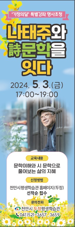 [충청뉴스큐] 천안시 두정평생학습관팀은 3일 ‘가정의의 달’을 맞아 ‘명사초청 나태주와 詩문학을 잇다’를 개최했다.
