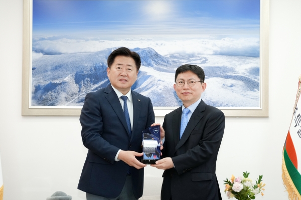 오영훈 지사는 3일 오후 1시 40분 집무실에서 최용석 국립수산과학원장에게 명예도민패와 명예도민증을 전달했다.