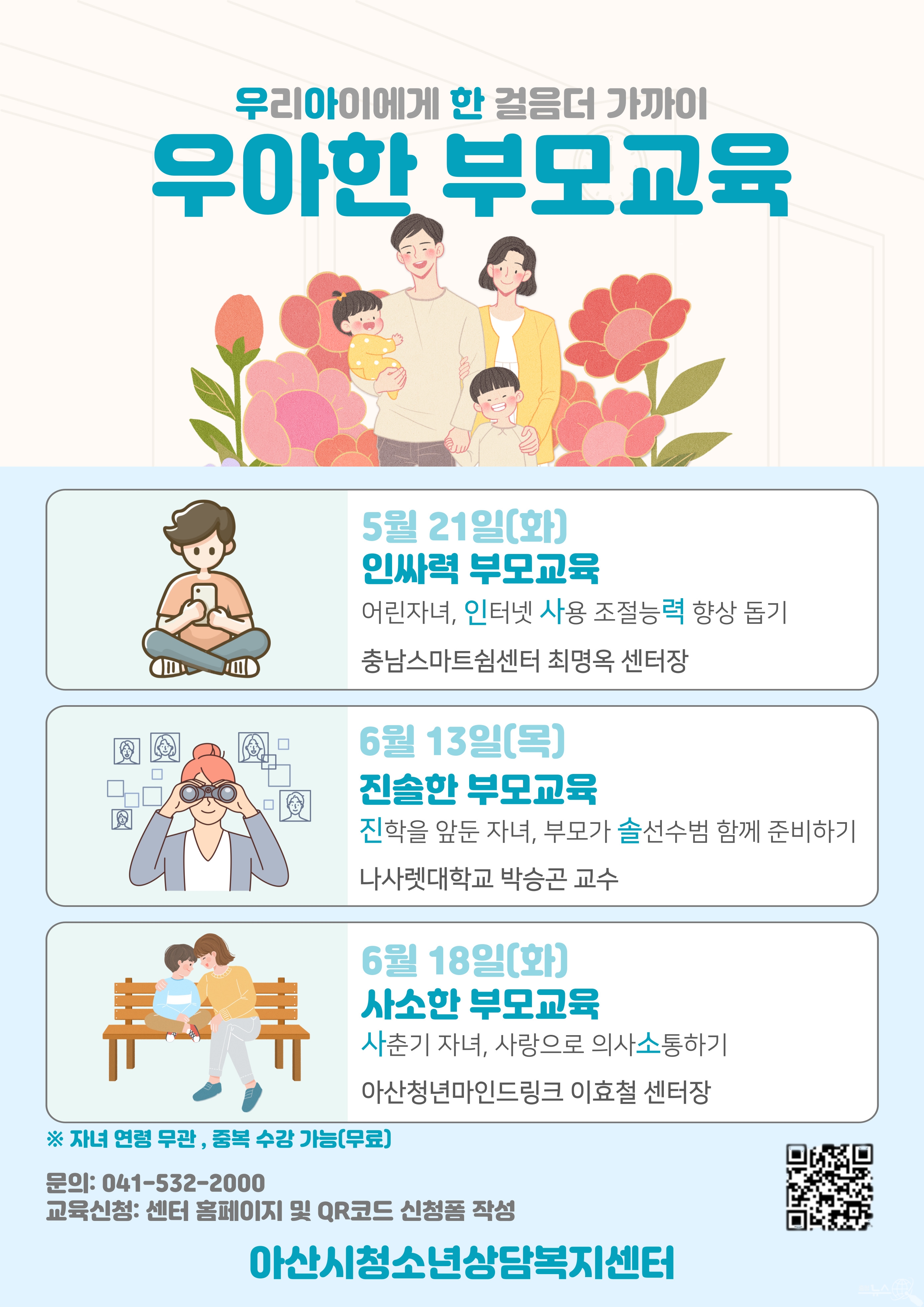 교육은 오는 21일부터 3회에 걸쳐 각 분야 전문가의 심층적인 강으로 진행된다. 21일에는 최명옥 센터장(충남스마트쉼센터)이 ‘어린 자녀, 인터넷 사용 조절 능력 향상돕기’라는 주제로 강의하고, 6월 13일은 박승곤 교수(나사렛대학교 사회복지학부)가‘진학을 앞둔 자녀, 부모가 솔선수범 함께 준비하기’라는 주제로 강의한다. 마지막으로 6월 18일은 이효철 센터장(아산청년마인드링크)의 ‘사춘기 자녀, 사랑으로 의사소통하기’라는 주제로 교육이 진행된다.