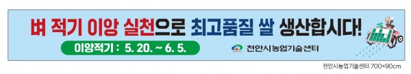[충청뉴스큐] 천안시농업기술센터는 최고품질 흥타령쌀 생산을 위해 오는 7일부터 20일까지를 적기 모내기 중점 지도기간으로 정하고 현수막 게시를 통한 홍보 및 적극적인 현장지도에 나섰다고 8일 밝혔다.