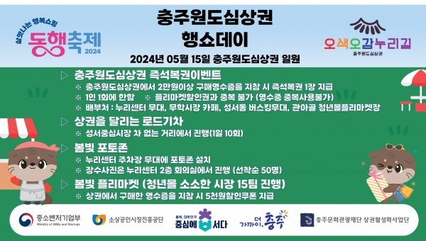 이번 행사는 전국적인 소비 촉진 행사인 중소벤처기업부 ‘2024년 5월 동행축제’에 맞추어 충주 원도심에서만 즐길 수 있는 특색 있는 체험 및 이벤트 등으로 진행된다.