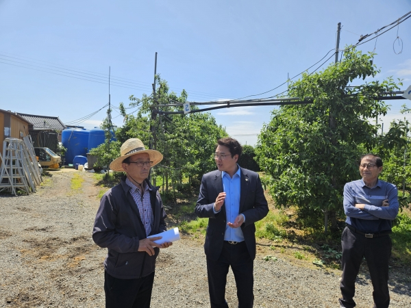 [충청뉴스큐] 예산군의회 홍원표부의장은 8일 오후 예산군 사과발전 연구회 회원 및 군 관계공무원과 함께 신암면 사과농가 현장을 방문해 이상기후로 인한 사과농가의 피해 현황을 청취하는 등 현장점검을 했다.
