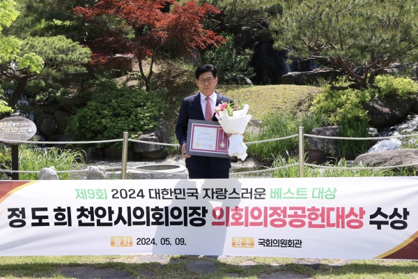 [충청뉴스큐] 정도희 천안시의회 의장은 9일 국회의원회관 소회의실에서 대한민국 자랑스러운 베스트혁신위원회에서 주최한 ‘제9회 2024 대한민국 자랑스러운 베스트대상 시상식에서 의회의정공헌대상 수상의 영예를 안았다.