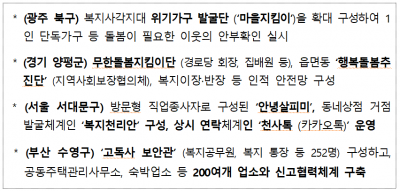 한편, 국민들의 참여 여건 조성을 위해 국민건강보험 등 4대 보험 통합고지서에 복지 위기가구 발굴·지원 안내 문구를 게재하고, 지역 반상회보에도 위기가구 신고 포스터를 첨부했다.