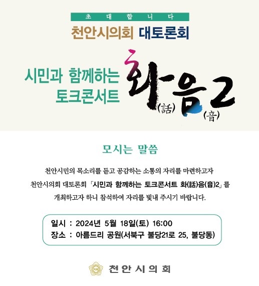 [충청뉴스큐] 천안시의회는 18일 불당동 아름드리공원에서 시민과 함께하는 토크콘서트 ‘화음 2’를 개최할 예정이다.