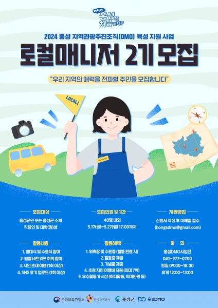 [충청뉴스큐] 5년 연속 지역관광추진조직 육성지원 사업에 선정된 홍성군이 생활인구 유입증대를 위한 ‘어서와 홍성은 처음이지’사업의 주민 로컬매니저를 오는 27일까지 모집한다.