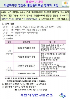 [충청뉴스큐] 수원시장안구보건소가 다문화 예비 엄마에게 도움이 되는 ‘다문화 가정 출산준비교실’을 운영한다.