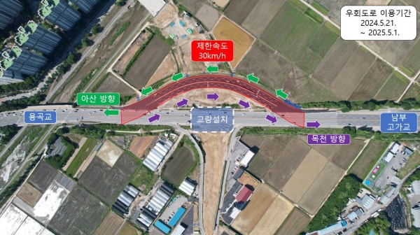 [충청뉴스큐] 천안시는 오는 21일부터 2025년 5월 1일까지 약 1년간 남부대로~용곡 한라아파트 간 연결도로 개설공사를 위해 기존 남부대로 임시 우회도로 이용 및 통행속도를 제한한다고 밝혔다.