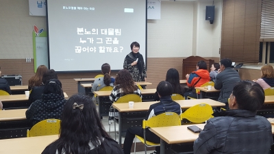 이번 연수는 인성소통협회 양성희 강사를 모시고 가족 갈등 예방 및 가정의 교육적 기능 강화를 위해 ‘욱하는 당신을 위해’라는 주제로 프로그램을 운영했다. 일상에서 욱하고 올라오는 분노감정을 불통의 신호로 이해하고 자신의 분노습관과 건강하게 표현하는 방법을 통해 긍정에너지로 다스릴 수 있는 시간을 가졌다.