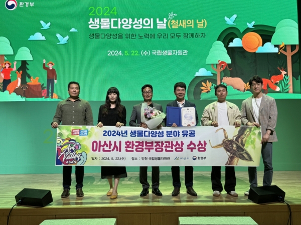 [충청뉴스큐] 아산시는 지난 22일 국립생물자원관 생생채움 대강당에서 환경부에서 주최한 ‘2024년도 생물다양성의 날 기념행사’에서 ‘생물다양성 분야 유공 환경부장관 표창’ 수상의 영예를 안았다.