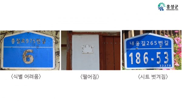 이에 홍성군은 건물번호판 전수조사 결과에 따라 지난해 홍성읍의 노후 건물번호판 5,800여 개소를 무상 교체했으며 올해는 광천읍의 노후 건물번호판 4,000여 개소에 대해 무상으로 교체를 진행한다.