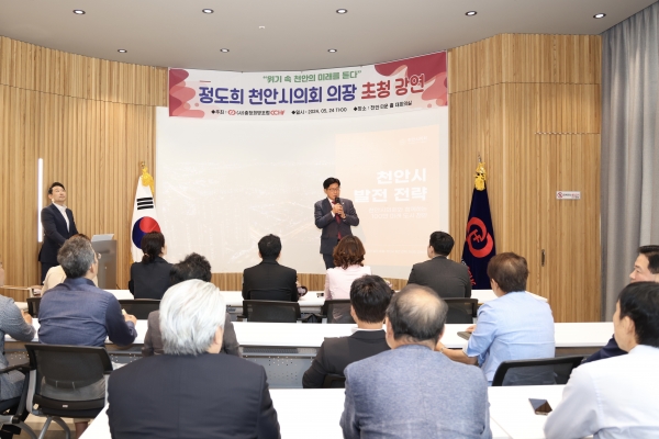 [충청뉴스큐] 정도희 천안시의회 의장은 24일 천안타운홀에서 열린 사단법인 충청희망포럼에서 주최한 월례회에서 천안시의회 의장자격으로 “천안시 미래발전 전략”에 대해 특강을 했다.