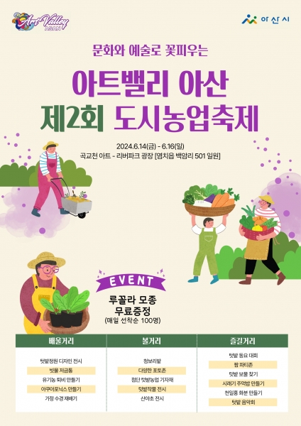 [충청뉴스큐] 아산시가 도시농업 및 문화예술 교류의 장을 열어줄 ‘아트밸리 아산 제2회 도시농업축제’를 6월 14일부터 16일까지 3일간 곡교천 아트-리버파크 광장에서 개최한다.