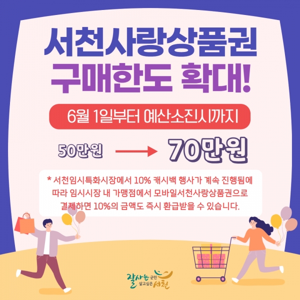 [충청뉴스큐] 서천군이 오는 6월 1일부터 서천사랑상품권의 개인별 구매 한도를 50만원에서 70만원으로 상향한다.