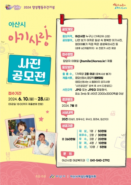 아산시민 누구나 참여할 수 있으며 나만 보기 아까운 일상 속 행복한 아기사진, 엄마 아빠가 직접 찍은 생생육아사진 등이 주제다.