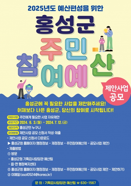 [충청뉴스큐] 홍성군이 예산편성 과정에 주민의 참여기회를 보장하고 재정 운영의 투명성과 공정성을 높이기 위해 2025년도 예산편성을 위한 주민참여예산 제안사업 공모를 실시한다.