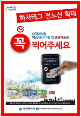 이에 대전시는 하차태그율을 높이기 위해 지난 3월말까지 시내버스 전 차량에 하차태그 안내방송과 홍보물을 부착하고, 앞으로도 시내지역 전광판, BIT, 교통카드 단말기, 유개승강장, 하차태그 관련 이벤트를 실시하는 등 지속적인 홍보를 이어갈 방침이다.