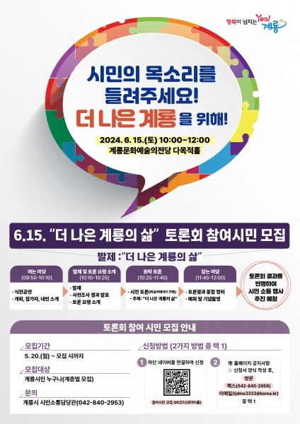[충청뉴스큐] 계룡시가 오는 6월 15일 계룡문화예술의전당에서 개최되는 ‘더 나은 계룡의 삶’ 토론회 참여 시민을 모집한다고 밝혔다.