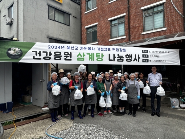 [충청뉴스큐] 예산군자원봉사센터는 센터 주차장에서 거점캠프 활동가 및 봉사자 20여명이 모여 취약계층 가구에게 나눌 ‘건강응원 삼계탕 나눔’ 행사를 개최했다고 4일 밝혔다.