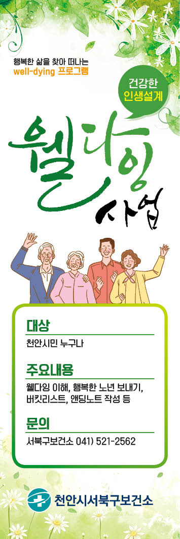 이는 ‘천안시 호스피스·완화의료 및 웰다잉 문화조성에 관한 조례’에 근거해 고령화 시대에 맞는 건강한 인생을 설계하고 삶의 가치와 중요성에 대한 인식을 확산시키자는데 목적을 두고 있다.